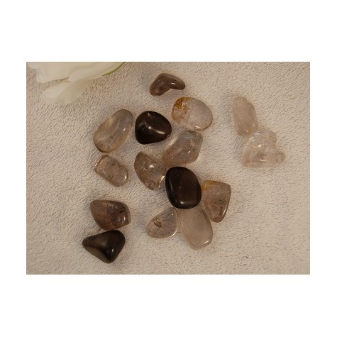Trommelsteen van Rook Kwarts. Van bijna geheel doorzichtig en kleurloos tot zeer donker.